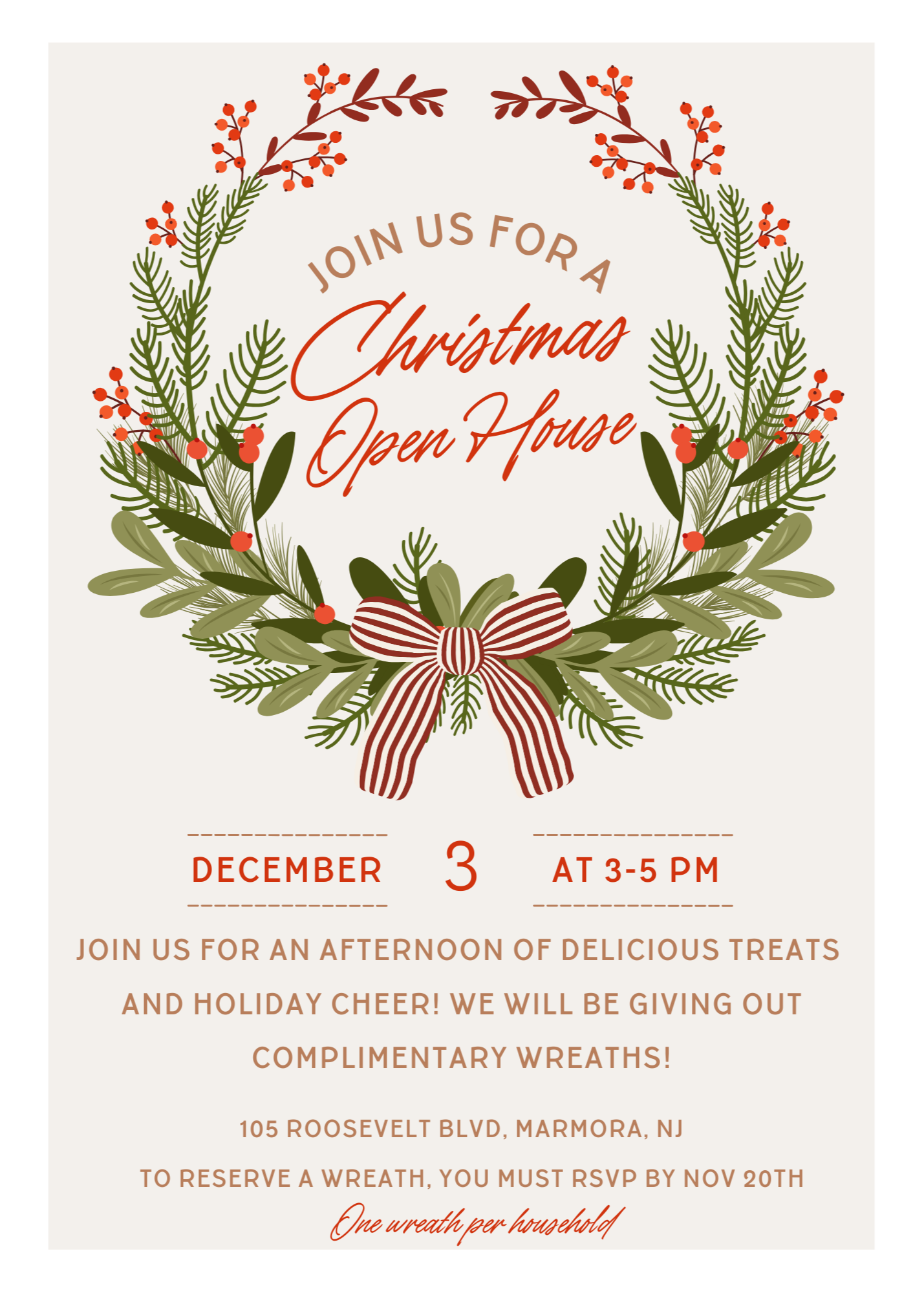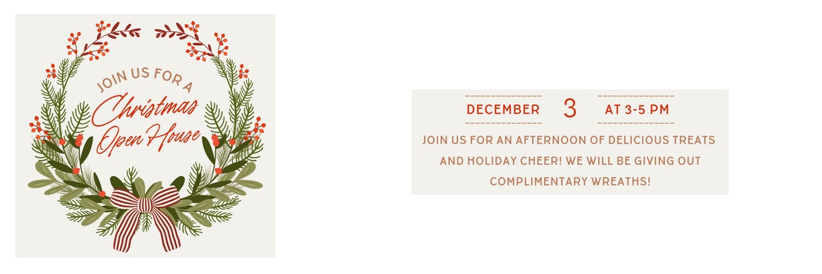 Join us for our Christmas Open House on Thursday, December 3rd from 3 pm to 5 pm! We will be giving out complimentary wreaths. To secure your wreath (one per household), please RSVP by November 20th. Thank you!