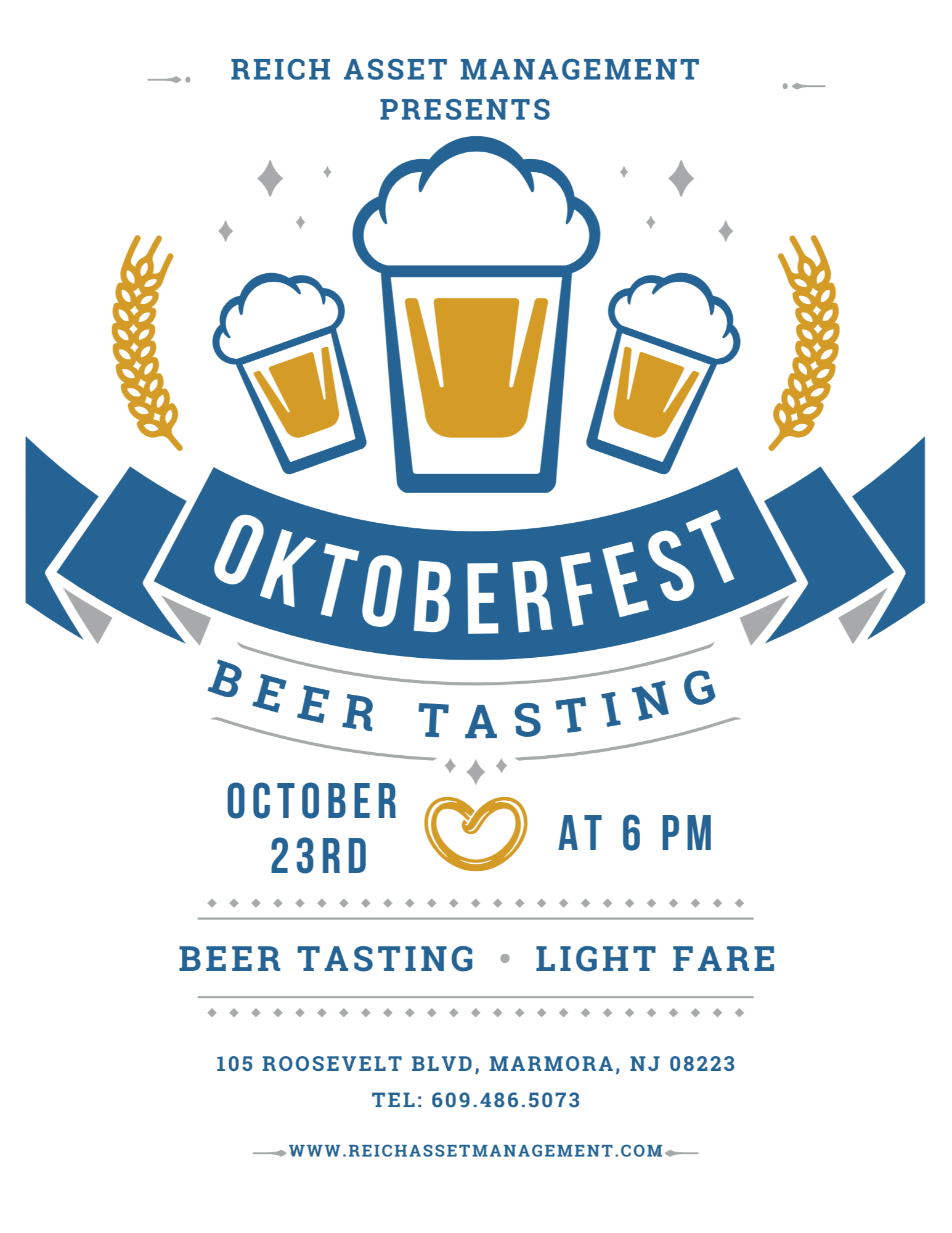 To confirm your attendance, please register online or RSVP to Amy Mahon at amy@reichassetmanagement.com or (609) 486-5073 by Monday, October 20th. Since space is limited, we kindly ask that any cancellations be made 3 days prior to the event. Thank you!